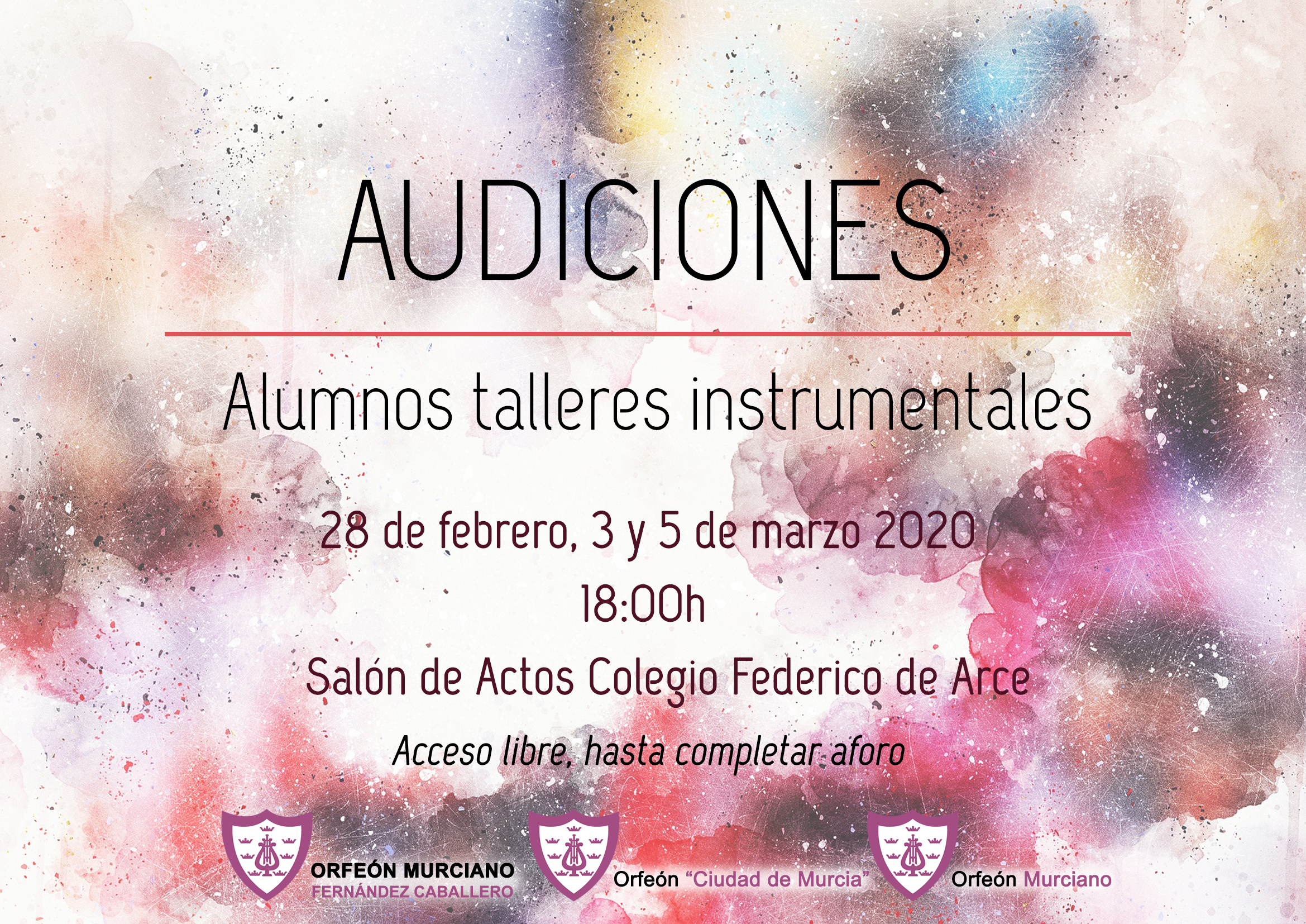 🎹El 28 de febrero, 3 y 5 de marzo de 2020 nuestros alumnos de los talleres instrumentales realizarán diferentes audiciones en el Salón de Actos del CEIP Federico de Arce, a las 18:00h.