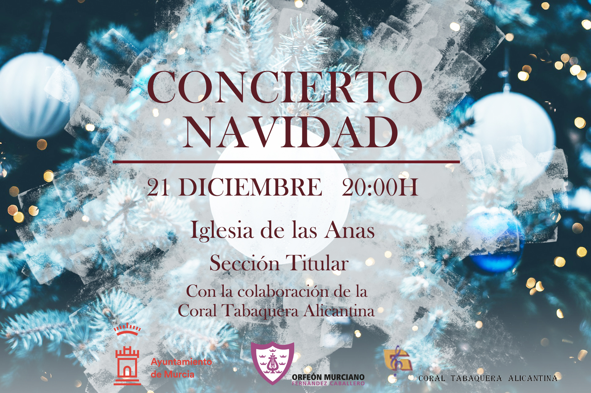 La sección Titular del Orfeón Murciano Fernández Caballero dará un concierto de Navidad que tendrá lugar el viernes 21 de diciembre a las 20:00 en la iglesia de Las Anas. Contará con la colaboración de la Coral Tabaquera Alicantina.