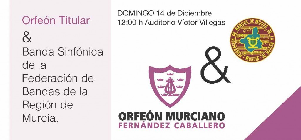 El próximo domingo 14 de diciembre el Orfeón Titular ofrecerá un concierto junto con la Banda Sinfónica de la Federación de Bandas de la Región de Murcia.
